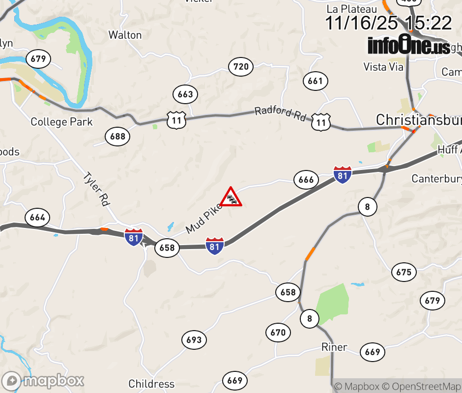 On Rt. 666 in the County of Montgomery, in the vicinity of Gate Rd; Rt. 724N/S (Montgomery County), motorists can expect delays due to weather. All east lanes are closed. All west lanes are closed. ![]() |