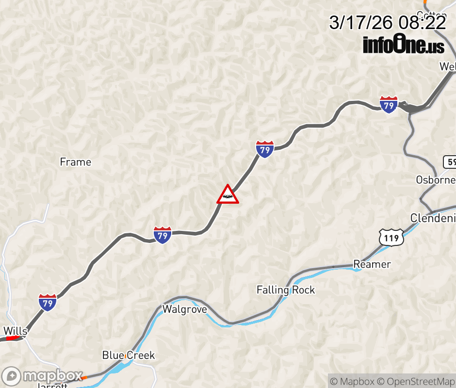 Vehicle Crash on I-79S at Mile Marker 15.0. The southbound left lane is closed. Updated: Tue 3/17/26 8:22 AM EDT ![]() Updated: Tue 3/17/26 8:22 AM EDT |