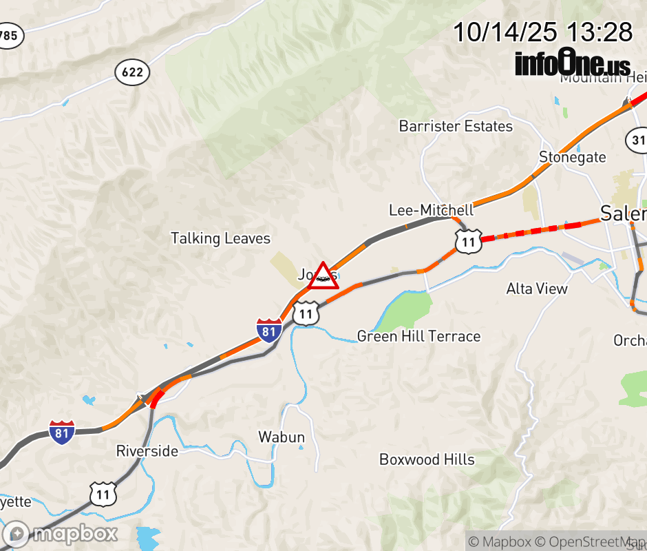 On I-81 South at mile marker 135.2 in the County of Roanoke, motorists can expect delays due to a tractor trailer crash. Updated: Tue 10/14/25 1:28 PM EDT ![]() Updated: Tue 10/14/25 1:28 PM EDT |