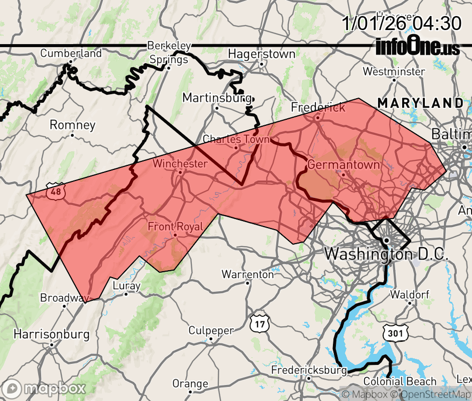Canceled 1/1/26 5:08 AM Snow Squall Warning issued January 1 at 4:29AM EST until January 1 at 5:30AM EST by NWS Baltimore MD/Washington DC The National Weather Service in Sterling Virginia has issued a * Snow Squall Warning for... Southeastern Washington County in north central Maryland... Howard County in central Maryland... Montgomery County in central Maryland... Southern Frederick County in north central Maryland... Southwestern Baltimore County in northern Maryland... South central Carroll County in north central Maryland... Loudoun County in northern Virginia... Shenandoah County in northwestern Virginia... Frederick County in northwestern Virginia... Northeastern Rockingham County in western Virginia... Warren County in northwestern Virginia... Clarke County in northwestern Virginia... The City of Winchester in northwestern Virginia... Jefferson County in the Panhandle of West Virginia... Central Hardy County in eastern West Virginia... South central Berkeley County in the Panhandle of West Virginia... Southeastern Hampshire County in eastern West Virginia... * Until 530 AM EST. * At 429 AM EST, a dangerous snow squall was located along a line extending from near New Market to near Berryville to near Moorefield, moving southeast at 35 mph. HAZARD...Intense bursts of heavy snow. Gusty winds leading to blowing snow and visibility rapidly falling to less than one-quarter mile. Wind gusts up to 35 mph. SOURCE...Radar and webcams. IMPACT...Dangerous and life-threatening travel conditions are expected to develop rapidly in the warning area. This includes the following highways... Interstate 70 in Maryland between mile markers 49 and 88. Interstate 95 in Maryland between mile markers 35 and 45. Interstate 270 in Maryland between mile markers 1 and 32. Locations impacted include... Columbia, Germantown, Frederick, Rockville, Bethesda, Gaithersburg, Leesburg, Olney, Winchester, South Riding, Elkridge, Damascus, Front Royal, Broadlands, Lansdowne, Lowes Island, Brambleton, Strasburg, Charles Town, and Poolesville. ![]() |