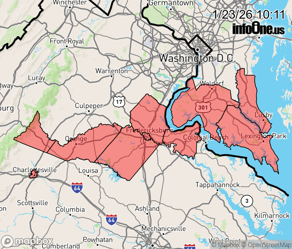 Canceled 1/23/26 4:10 PM Cold Weather Advisory issued January 23 at 10:09AM EST until January 24 at 10:00AM EST by NWS Baltimore MD/Washington DC * WHAT... Very cold wind chills as low as 5 below expected. * WHERE... In Maryland, Calvert, Charles, and St. Marys Counties. In Virginia, Albemarle, Greene, King George, Orange, Spotsylvania, and Stafford Counties. * WHEN... From 8 PM this evening to 10 AM EST Saturday. * IMPACTS... Wind chill values can lead to hypothermia with prolonged exposure. ![]() |