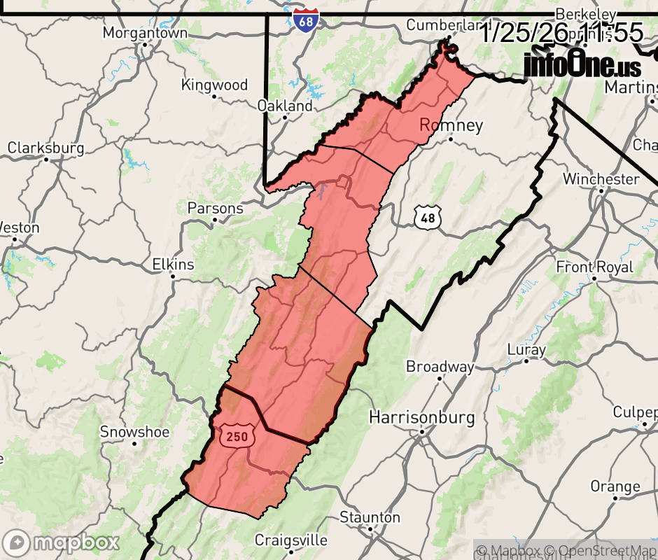Canceled 1/25/26 7:44 PM Extreme Cold Watch issued January 25 at 11:53AM EST until January 27 at 11:00AM EST by NWS Baltimore MD/Washington DC * WHAT... Dangerously cold wind chills as low as 25 below zero possible, locally nearing 35 below zero in western Pendleton County. * WHERE... In Maryland, Eastern Garrett and Western Garrett Counties. In Virginia, Eastern Highland and Western Highland Counties. In West Virginia, Eastern Pendleton, Western Grant, Western Mineral, and Western Pendleton Counties. * WHEN... From Monday evening through Tuesday morning. * IMPACTS... The dangerously cold wind chills as low as 25 below zero could cause frostbite on exposed skin in as little as 30 minutes. Frostbite and hypothermia will occur if unprotected skin is exposed to these temperatures. ![]() |