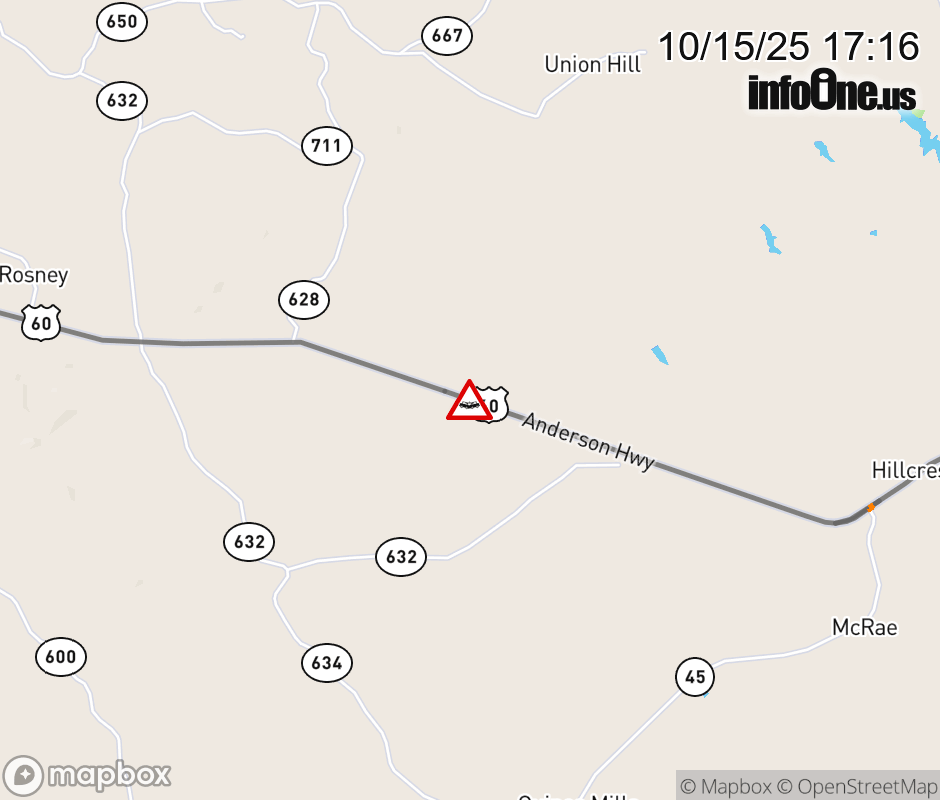 On US-60 in the County of Cumberland, in the vicinity of White Pine Ln; County/City/Town Line: CUMBERLAND CL/BUCKINGHAM CL, motorists can expect delays due to a tractor trailer crash. All west lanes are closed. Updated: Wed 10/15/25 5:16 PM EDT ![]() Updated: Wed 10/15/25 5:16 PM EDT |