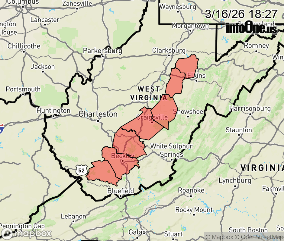 Canceled 3/16/26 6:29 PM Winter Weather Advisory issued March 16 at 6:26PM EDT until March 17 at 8:00AM EDT by NWS Charleston WV * WHAT... Snow. Additional snow accumulations between 1 and 3 inches. Winds gusting as high as 35 mph. * WHERE... Portions of northeast, northern, southeast, and southern West Virginia. * WHEN... Until 8 AM EDT Tuesday. * IMPACTS... Plan on slippery road conditions. The hazardous conditions could impact the Tuesday morning commute. ![]() |
