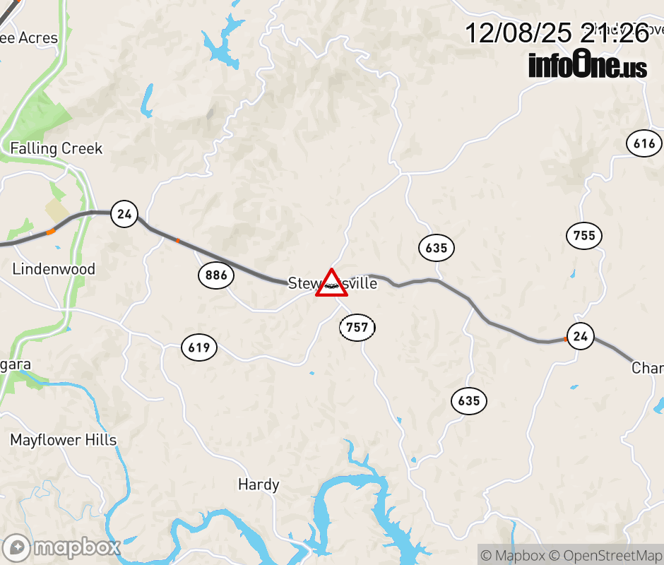 On Rt. 619 East in the County of Bedford, in the vicinity of Wildcat Rd; Rt. 791E/W (Bedford County), motorists can expect delays due to a vehicle crash. Lane closures exist. ![]() |