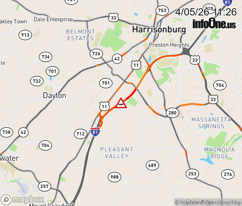 On I-81 at mile marker 244.3 in the County of Rockingham, motorists can expect delays due to a vehicle crash. The north right shoulder is closed. Updated: Sun 4/5/26 11:26 AM EDT ![]() Updated: Sun 4/5/26 11:26 AM EDT |