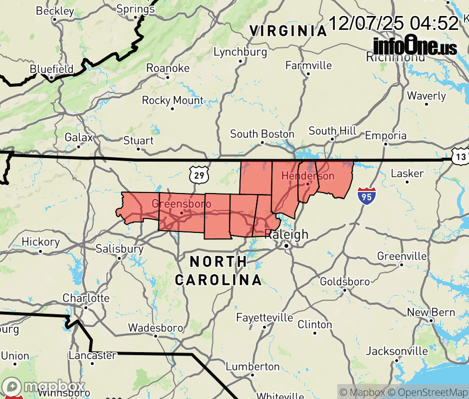 Canceled 12/7/25 8:33 AM Freezing Fog Advisory issued December 7 at 4:50AM EST until December 7 at 9:00AM EST by NWS Raleigh NC * WHAT... Visibility one quarter mile or less in freezing fog. * WHERE... Northern portions of central North Carolina, including areas north of a line from Lexington to Wilson. * WHEN... Until 9 AM EST this morning. * IMPACTS... Low visibility could make driving conditions hazardous. ![]() |