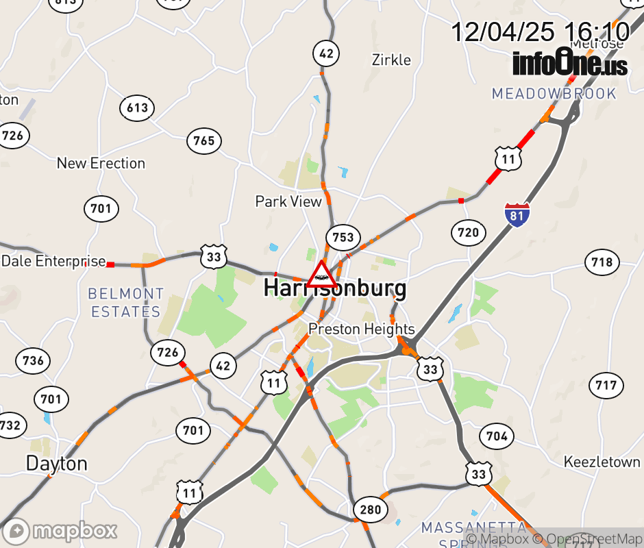 On VA-42 in the City of Harrisonburg, in the vicinity of W Wolfe St; City Rt. 4110E/W (City of Harrisonburg), motorists can expect delays due to a vehicle crash. All north lanes are closed. All south lanes are closed. ![]() |