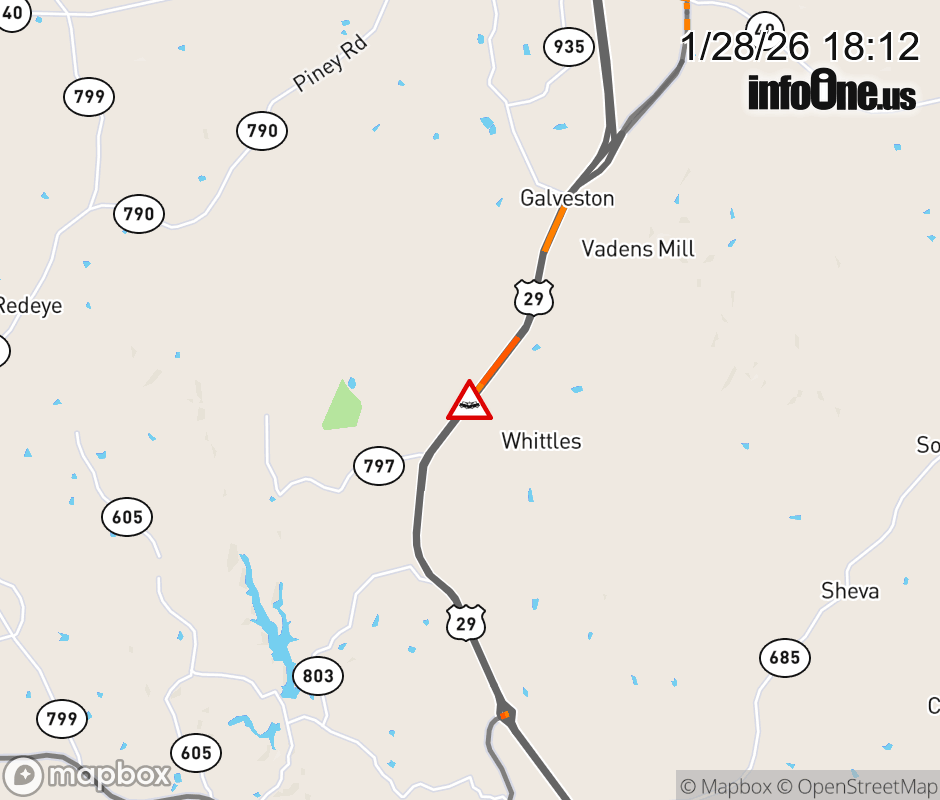 On US-29 in the County of Pittsylvania, in the vicinity of Anderson Mill Rd; Rt. 649E/W (Pittsylvania County); Rt. 649E (Pittsylvania County), motorists can expect delays due to a tractor trailer crash. The south left shoulder and left lane are closed. ![]() |
