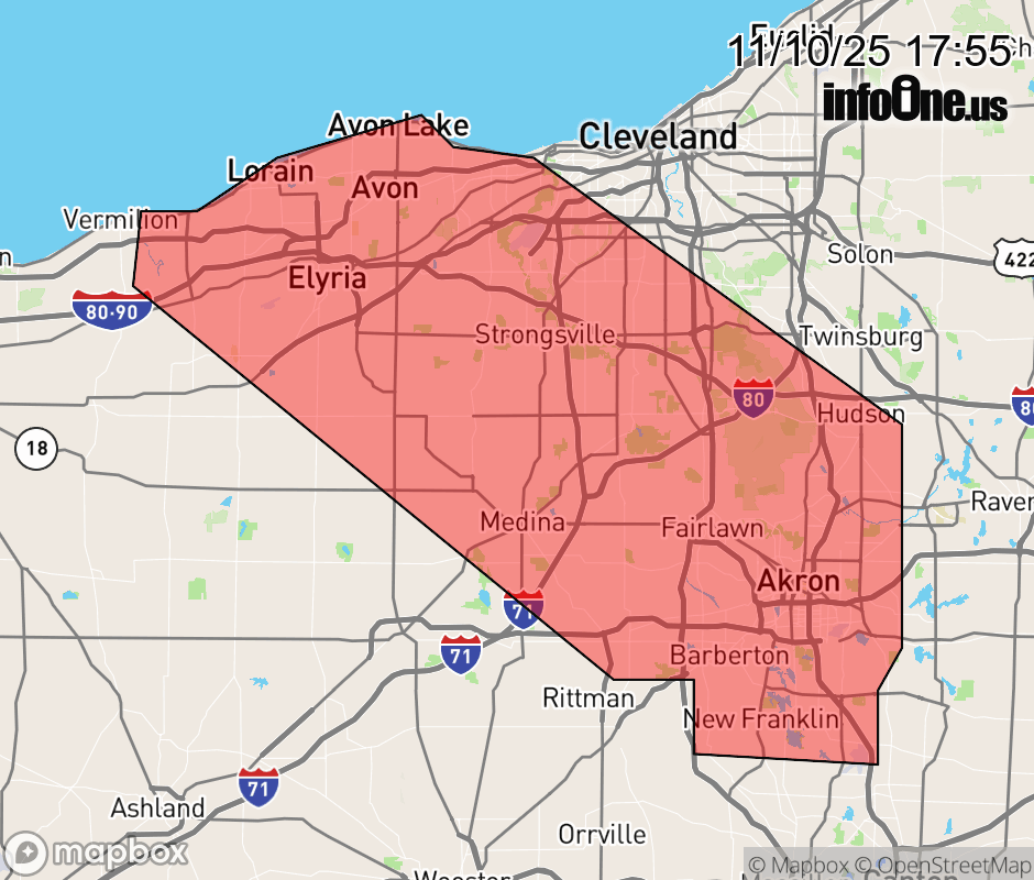 Canceled 11/10/25 7:00 PM Special Weather Statement issued November 10 at 5:53PM EST by NWS Cleveland OH At 553 PM EST, radar indicated an intense lake effect snow band along a line extending from near Vermilion to 8 miles east of Medina, moving east at 5 mph. HAZARDS INCLUDE... Visibility rapidly dropping to less than a quarter of a mile... Up to an inch of quick snow accumulation... Locations impacted include... Cleveland, Akron, Lorain, Elyria, Medina, Vermilion, Parma, Lakewood, Cuyahoga Falls, Strongsville, Brunswick, Westlake, North Royalton, North Ridgeville, Kent, Barberton, Green, Avon Lake, Hudson, and Wadsworth. Use extra caution if you must travel into or through this lake effect snow band. Rapid changes in visibility and potentially slick roads are likely to lead to accidents. Consider delaying travel until this snow band passes your location. ![]() |