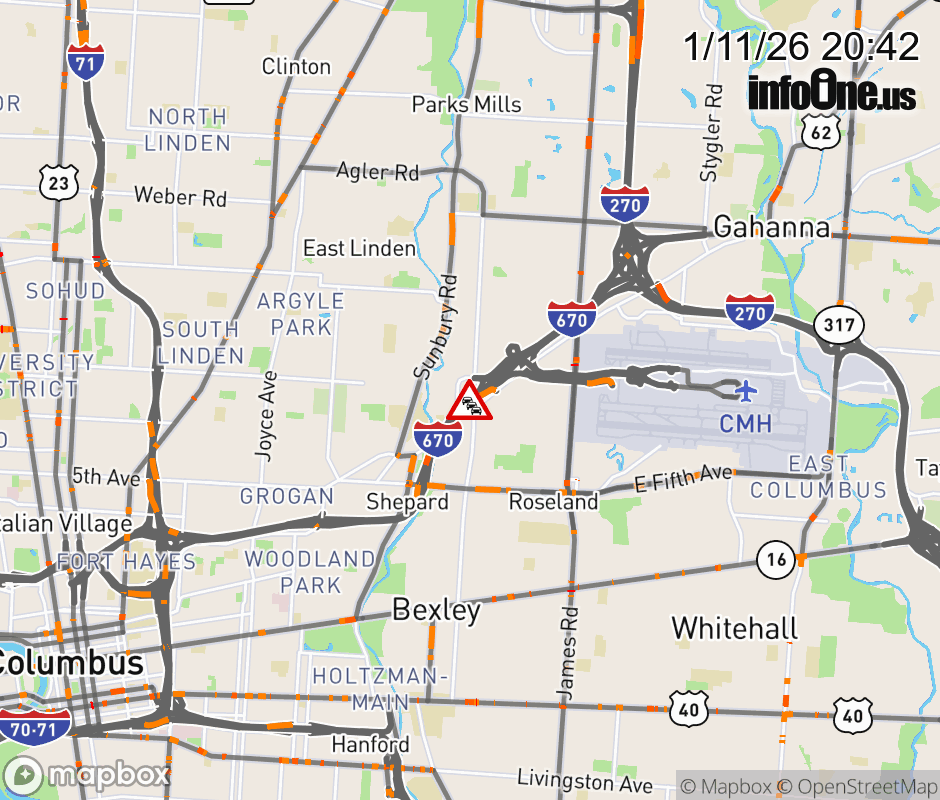 The right lane is blocked on I-670/US-62 West beyond Airport/Cassady Ave/Stelzer Rd, due to repairs/maintenance. ![]() Updated: Sun 1/11/26 8:42 PM EST |