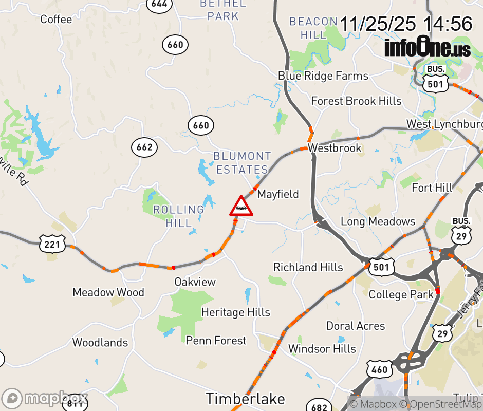 On US-221 in the County of Bedford, in the vicinity of Graves Mill Rd; Rt. 1425E/W (Bedford County); Rt. 1425E (Bedford County), motorists can expect delays due to a vehicle crash. All north lanes are closed. ![]() |