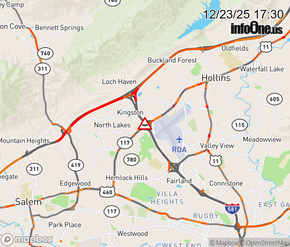 On I-581 at mile marker 5.5 in the County of Roanoke, motorists can expect delays due to a vehicle crash. The south exit 2N narrows. Updated: Tue 12/23/25 5:30 PM EST ![]() Updated: Tue 12/23/25 5:30 PM EST |