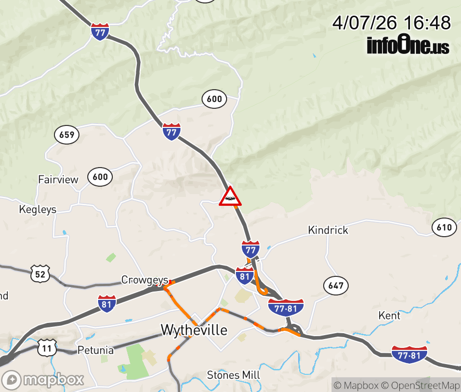 On I-77 at mile marker 43 in the County of Wythe, motorists can expect delays due to a vehicle crash. The south right shoulder is closed. ![]() |