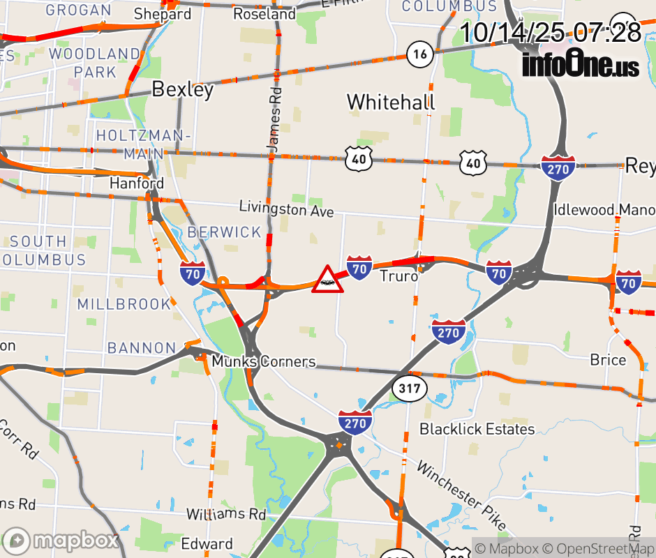 The left shoulder is blocked on I-70 West beyond SR-317/Hamilton Rd, due to a crash. Updated: Tue 10/14/25 7:28 AM EDT ![]() Updated: Tue 10/14/25 7:28 AM EDT |