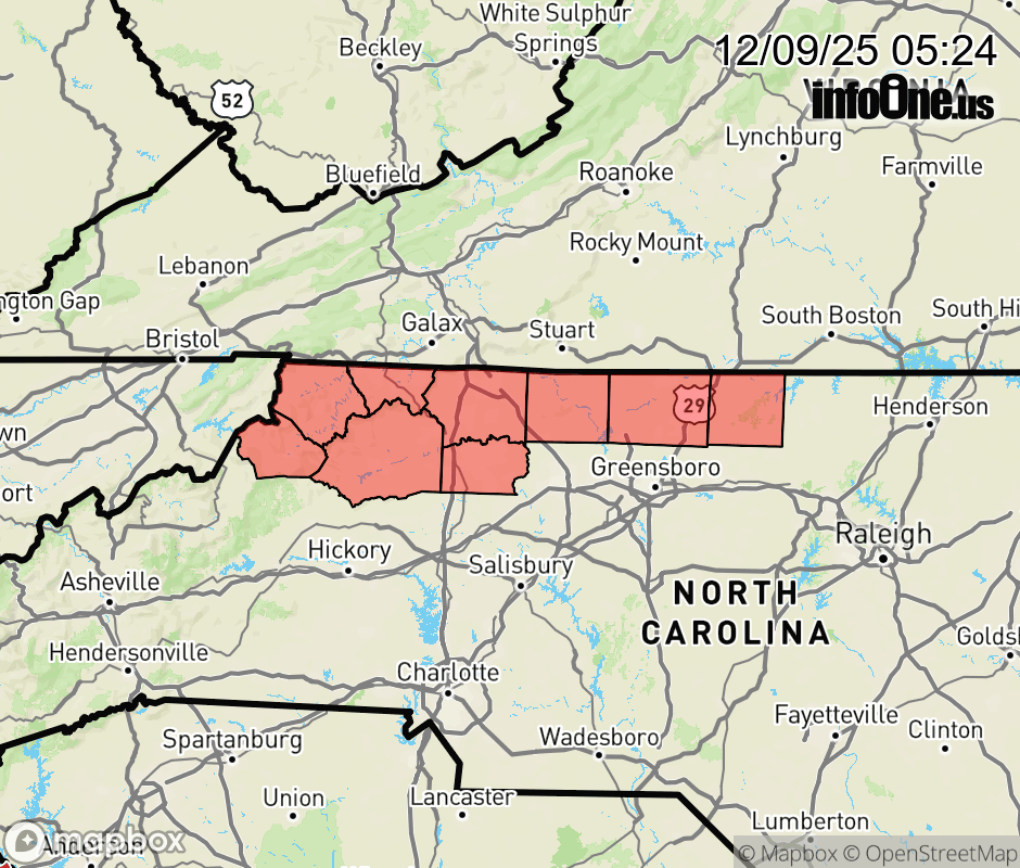 Canceled 12/9/25 12:00 PM Winter Weather Advisory issued December 9 at 5:22AM EST until December 9 at 12:00PM EST by NWS Blacksburg VA * WHAT... Areas of black ice. * WHERE... Portions of north central and northwest North Carolina. * WHEN... Until noon EST Today. * IMPACTS... Icy roads and sidewalks, resulting hazardous travel through the remainder of the morning. ![]() |