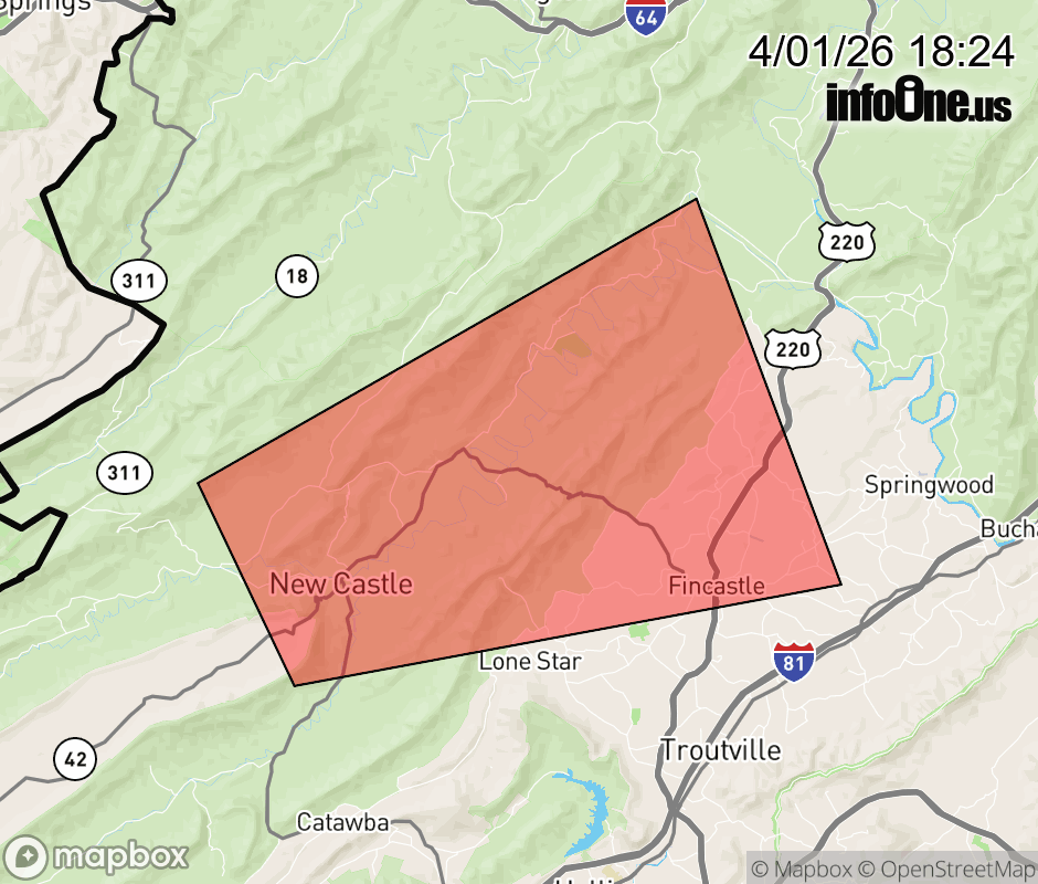 Canceled 4/1/26 7:00 PM Special Weather Statement issued April 1 at 6:23PM EDT by NWS Blacksburg VA At 623 PM EDT, Doppler radar was tracking a strong thunderstorm over New Castle, moving east at 25 mph. HAZARD...Wind gusts up to 50 mph and pea size hail. SOURCE...Radar indicated. IMPACT...Gusty winds could knock down tree limbs and blow around unsecured objects. Locations impacted include... New Castle... Oriskany... and Fincastle. ![]() |