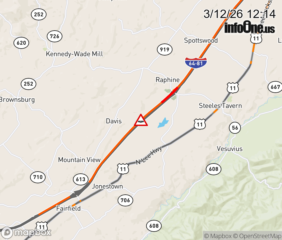 On I-81 South at mile marker 203.7 in the County of Rockbridge, motorists can expect delays due to a tractor trailer crash. Traffic backups are approximately 5.0 miles. Updated: Thu 3/12/26 12:14 PM EDT ![]() Updated: Thu 3/12/26 12:14 PM EDT |