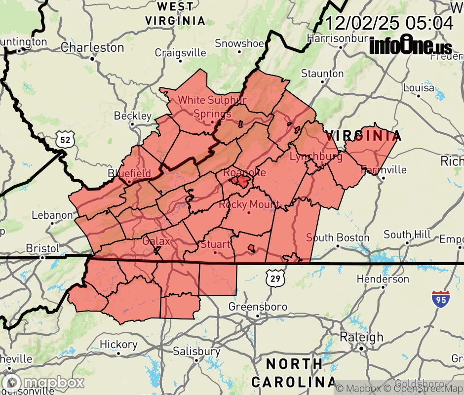 Canceled 12/2/25 11:16 AM Winter Weather Advisory issued December 2 at 5:02AM EST until December 2 at 12:00PM EST by NWS Blacksburg VA * WHAT... Freezing rain. Ice accumulations around two tenths of an inch. * WHERE... Portions of north central and northwest North Carolina, central, south central, southwest, and west central Virginia, and southeast West Virginia. * WHEN... Until noon EST today. * IMPACTS... Roads, and especially bridges and overpasses, will likely be slick and hazardous. Plan on slippery road conditions. The hazardous conditions may impact this morning's commute. ![]() |
