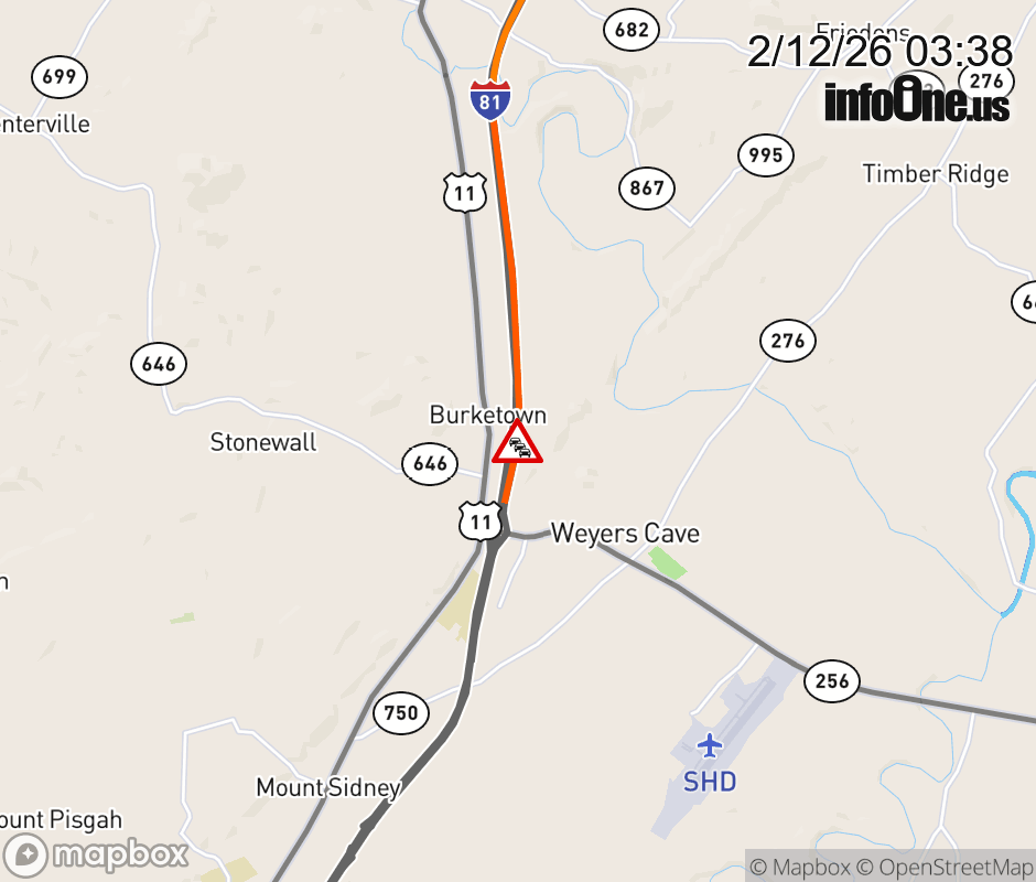 On I-81 at mile marker 236 in the County of Augusta, motorists can expect delays due to a vehicle fire. The north left shoulder is closed. Updated: Thu 2/12/26 3:38 AM EST ![]() Updated: Thu 2/12/26 3:38 AM EST |