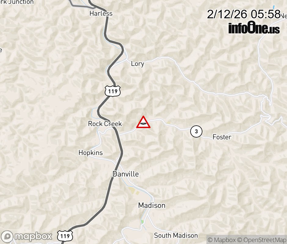 Vehicle Crash on WV-3 (1900 Daniel Boone Parkway). The northbound road is closed. The southbound road is closed. Updated: Thu 2/12/26 5:58 AM EST ![]() Updated: Thu 2/12/26 5:58 AM EST |