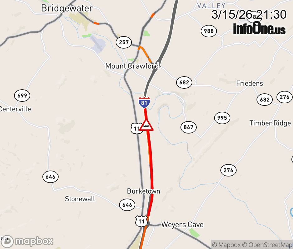 On I-81 at mile marker 238.2 in the County of Rockingham, motorists can expect delays due to a vehicle crash. The south left shoulder and left lane are closed. Updated: Sun 3/15/26 9:30 PM EDT ![]() Updated: Sun 3/15/26 9:30 PM EDT |