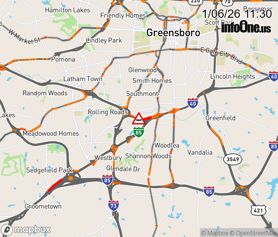 The right lane is closed past Exit 220 (Randleman Road). Updated: Tue 1/6/26 11:30 AM EST ![]() Updated: Tue 1/6/26 11:30 AM EST |