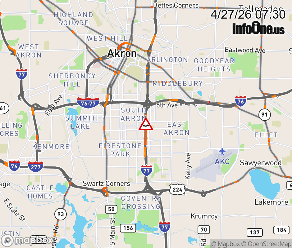 The right shoulder is blocked on I-77 North beyond SR-764/ Wilbeth Rd/Waterloo Rd, due to a crash. Updated: Mon 4/27/26 7:30 AM EDT ![]() Updated: Mon 4/27/26 7:30 AM EDT |