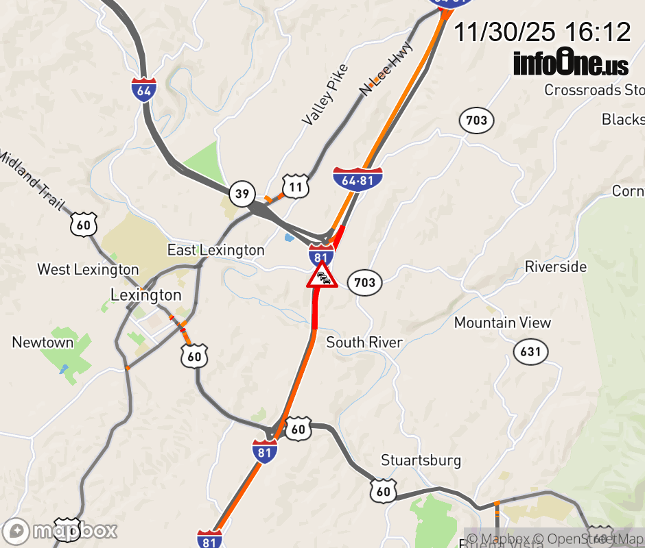 On I-81 North at mile marker 191 in the County of Rockbridge, motorists can expect delays due to congestion. Traffic backups are approximately 3.0 miles. Updated: Sun 11/30/25 4:12 PM EST ![]() Updated: Sun 11/30/25 4:12 PM EST |