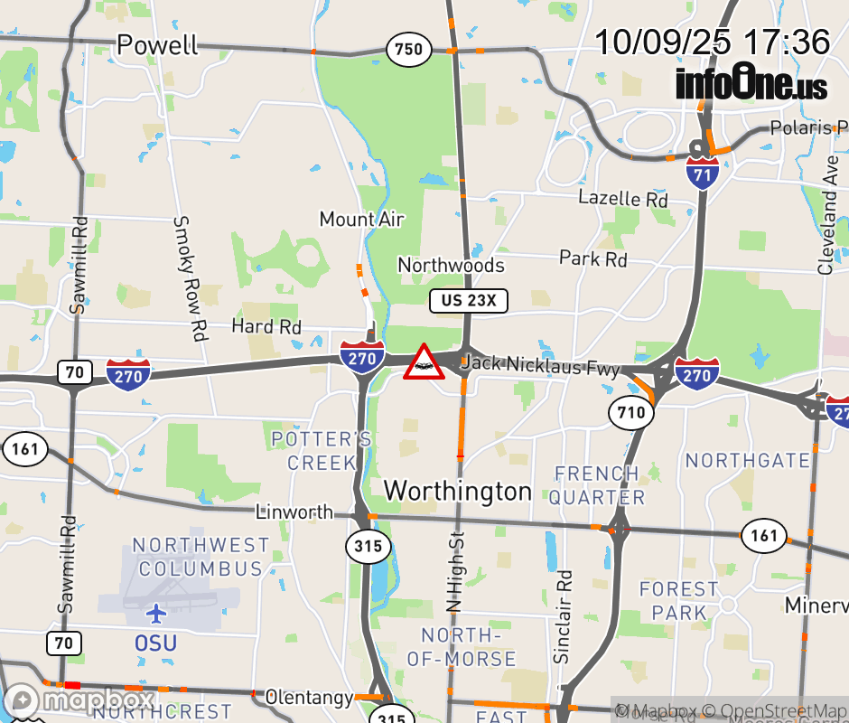 The 2 right lanes are blocked on I-270 East beyond US-23, due to a crash. Updated: Thu 10/9/25 5:36 PM EDT ![]() Updated: Thu 10/9/25 5:36 PM EDT |
