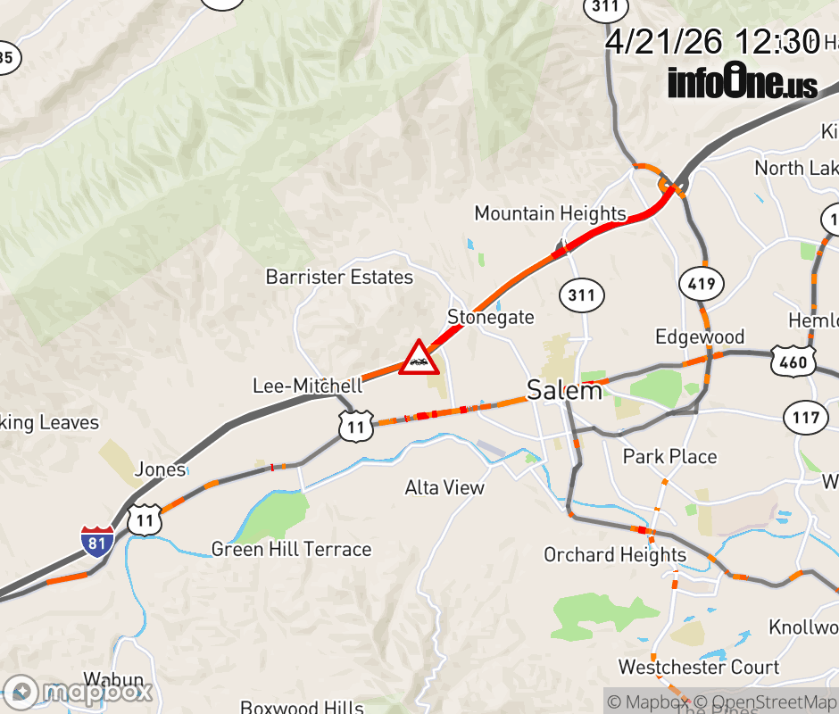 On I-81 South at mile marker 138.2 in the County of Roanoke, motorists can expect delays due to a disabled tractor trailer. Traffic backups are approximately 1.5 miles. Updated: Tue 4/21/26 12:30 PM EDT ![]() Updated: Tue 4/21/26 12:30 PM EDT |