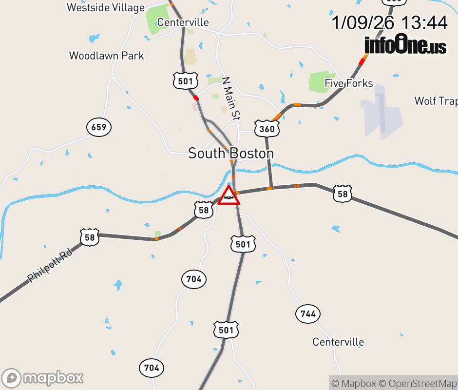 On US-58 in the County of Halifax, in the vicinity of Old Cluster Springs Rd; Riverdale Dr; Rt. 744N/S (Halifax County), motorists can expect delays due to a vehicle crash. The west right lane and right shoulder are closed. Updated: Fri 1/9/26 1:44 PM EST ![]() Updated: Fri 1/9/26 1:44 PM EST |