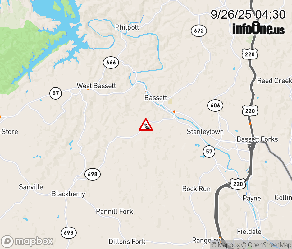 On Rt. 712 in the County of Henry, in the vicinity of Blackberry Rd; Rt. 698N/S (Henry County), motorists can expect delays due to weather. All north lanes are closed. All south lanes are closed. ![]() |