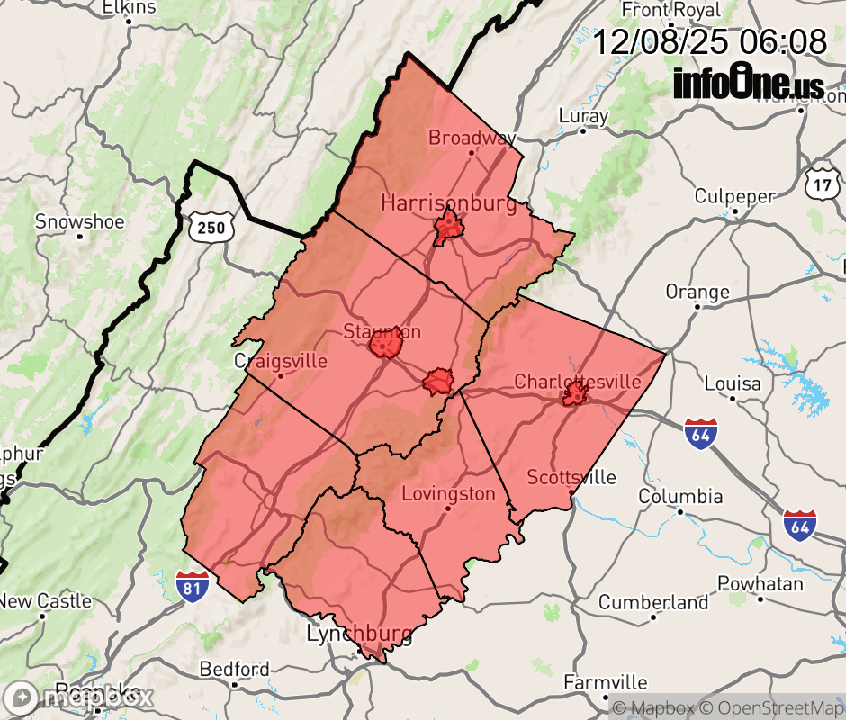 Winter Weather Advisory issued December 8 at 6:07AM EST until December 8 at 5:00PM EST by NWS Baltimore MD/Washington DC * WHAT... Snow expected. Total snow accumulations between 1 and 3 inches, with locally up to 4 inches possible along the Blue Ridge Mountains. * WHERE... Albemarle, Nelson, Augusta, and Rockingham Counties, and Central Virginia Blue Ridge. * WHEN... Until 5 PM EST this afternoon. * IMPACTS... Plan on slippery road conditions. The hazardous conditions could impact the morning and evening commutes. ![]() |