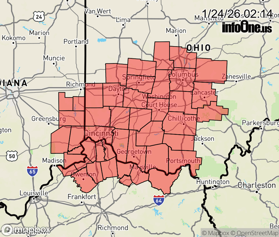 Canceled 1/24/26 11:56 AM Cold Weather Advisory issued January 24 at 2:12AM EST until January 24 at 12:00PM EST by NWS Wilmington OH * WHAT... Very cold wind chills as low as 10 below zero expected. * WHERE... Portions of east central and southeast Indiana, northeast and northern Kentucky, and central, south central, southwest, and west central Ohio. * WHEN... Until noon EST today. * IMPACTS... The cold wind chills as low as 10 below zero could result in hypothermia if precautions are not taken. ![]() |