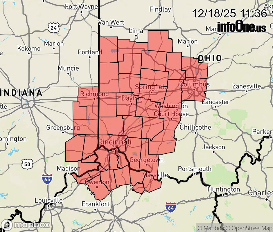 Canceled 12/18/25 9:55 PM Wind Advisory issued December 18 at 11:35AM EST until December 18 at 10:00PM EST by NWS Wilmington OH * WHAT... South winds 15 to 25 mph with gusts up to 45 mph expected. * WHERE... Portions of east central and southeast Indiana, northern Kentucky, and central, south central, southwest, and west central Ohio. * WHEN... Until 10 PM EST this evening. * IMPACTS... Gusty winds will blow around unsecured objects. Tree limbs could be blown down and a few power outages may result. ![]() |