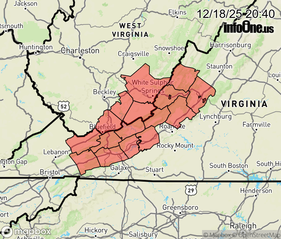 Canceled 12/19/25 4:18 AM Wind Advisory issued December 18 at 8:39PM EST until December 19 at 10:00PM EST by NWS Blacksburg VA * WHAT... West winds 20 to 30 mph with gusts up to 55 mph possible. * WHERE... Portions of southwest and west central Virginia and southeast West Virginia. * WHEN... From 7 AM to 10 PM EST Friday. * IMPACTS... Gusty winds will blow around unsecured objects. Tree limbs could be blown down and a few power outages may result. ![]() |