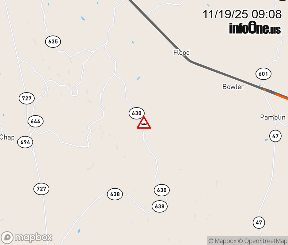 On Rt. 630 North in the County of Appomattox, in the vicinity of Tater Patch Rd; Rt. 731E/W (Appomattox County), motorists can expect delays due to a vehicle crash. Lane closures exist. ![]() |
