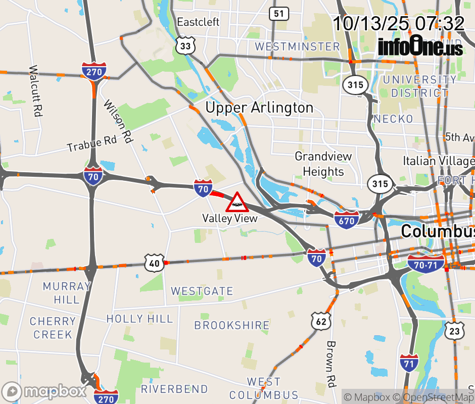 The right lane is blocked on I-70 East beyond Wilson Rd, due to a crash. Updated: Mon 10/13/25 7:32 AM EDT ![]() Updated: Mon 10/13/25 7:32 AM EDT |