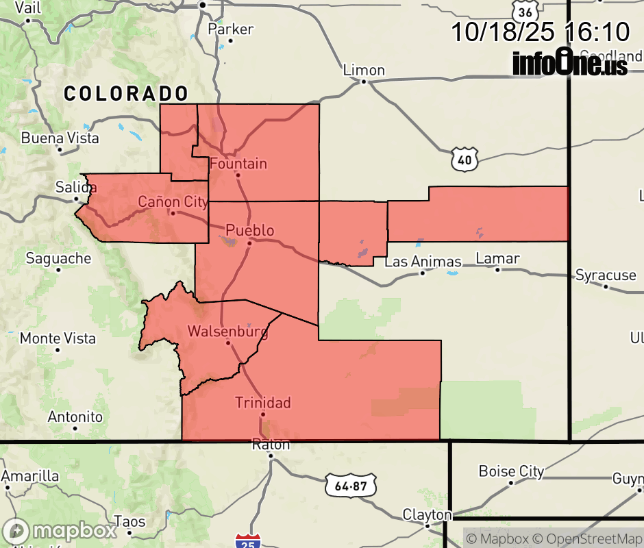 Canceled 10/19/25 5:53 AM Fire Weather Watch issued October 18 at 2:08PM MDT until October 20 at 6:00PM MDT by NWS Pueblo CO The National Weather Service in Pueblo has issued a Fire Weather Watch for gusty winds and low relative humidity, which is in effect from Monday morning through Monday afternoon. * AFFECTED AREA... Fire Weather Zones 222, 226, 227, 228, 229, 230, 231 and 234. * WINDS... North 15 to 25 mph with gusts up to 40 mph. * RELATIVE HUMIDITY... As low as 13 percent. * IMPACTS... Fires will catch and spread quickly. Exercise extreme caution with any outdoor burning. ![]() |