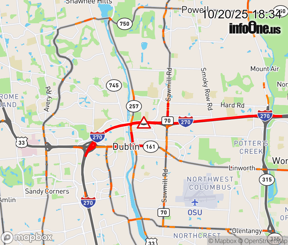 The 2 left lanes are closed on I-270 West beyond Sawmill Rd, due to a crash. Updated: Mon 10/20/25 6:34 PM EDT ![]() Updated: Mon 10/20/25 6:34 PM EDT |