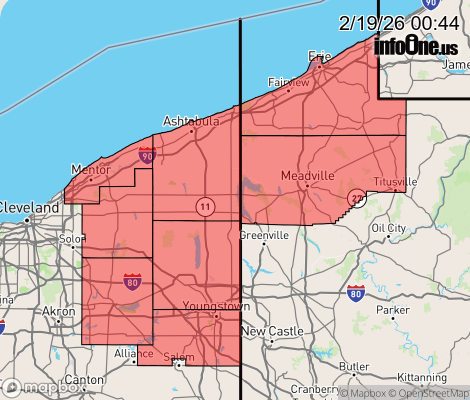 Canceled 2/19/26 4:17 AM Dense Fog Advisory issued February 19 at 12:43AM EST until February 19 at 9:00AM EST by NWS Cleveland OH * WHAT... Visibility less than one half mile at times in dense fog. * WHERE... In Ohio, Ashtabula Inland, Ashtabula Lakeshore, Geauga, Lake, Mahoning, Portage, and Trumbull Counties. In Pennsylvania, Crawford, Northern Erie, and Southern Erie Counties. * WHEN... Until 9 AM EST this morning. * IMPACTS... Low visibility could make driving conditions hazardous. ![]() |