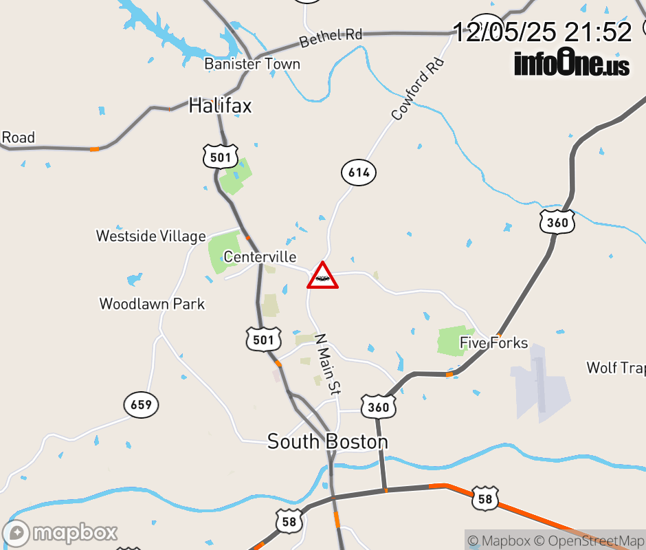 On Rt. 716 in the County of Halifax, in the vicinity of Love Shop Rd; Rt. 614N/S (Halifax County), motorists can expect delays due to a vehicle crash. All east lanes are closed. All west lanes are closed. ![]() |