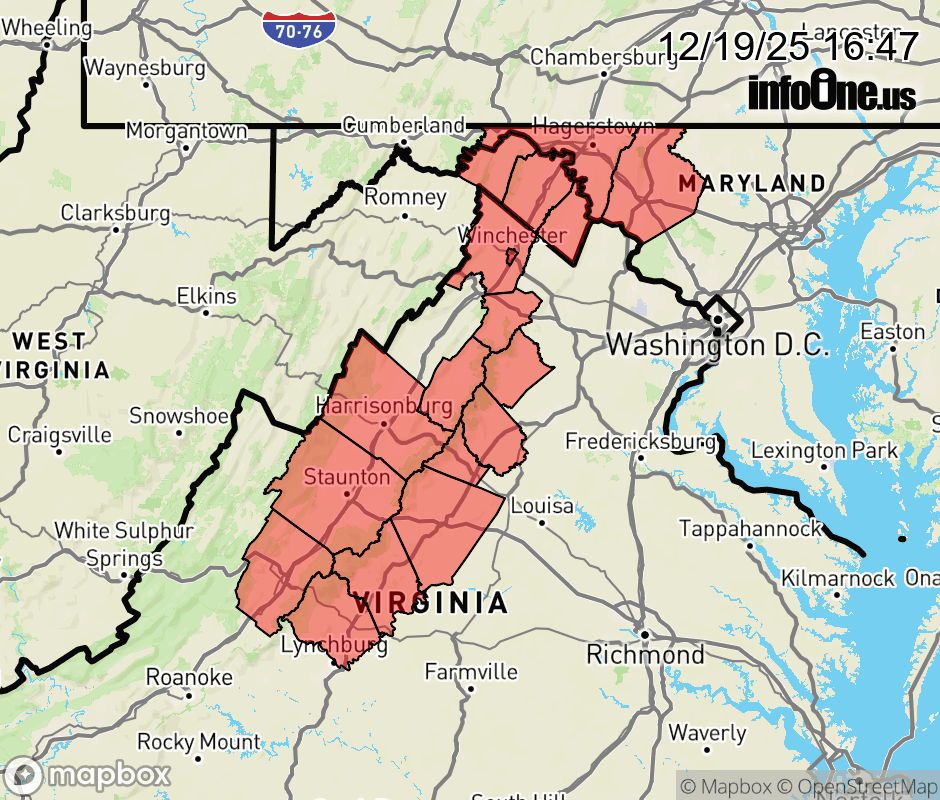 Canceled 12/19/25 6:36 PM Wind Advisory issued December 19 at 4:46PM EST until December 19 at 10:00PM EST by NWS Baltimore MD/Washington DC * WHAT... West winds 20 to 30 mph with gusts up to 50 mph. * WHERE... In Maryland, Frederick MD and Washington Counties. In Virginia, Central Virginia Blue Ridge and Northern Virginia Blue Ridge, and Frederick VA County. In West Virginia, Berkeley, Jefferson, and Morgan Counties. * WHEN... Until 10 PM EST this evening. * IMPACTS... Gusty winds will blow around unsecured objects. Tree limbs could be blown down and a few power outages may result. ![]() |