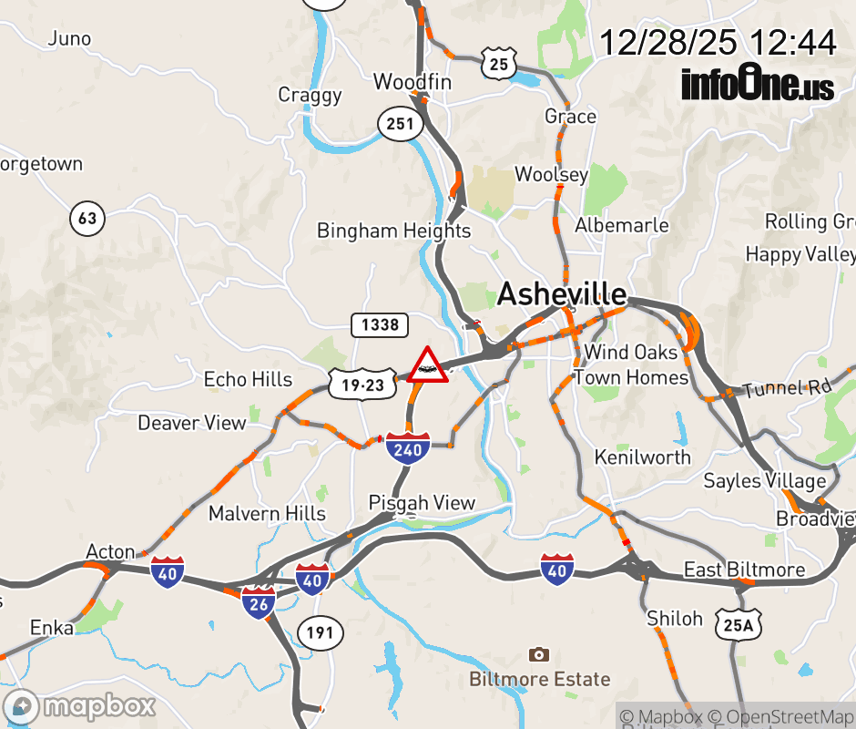 The right shoulder is closed after Exit 3A, US 19/23/74 ALT (Patton Avenue). Updated: Sun 12/28/25 12:44 PM EST ![]() Updated: Sun 12/28/25 12:44 PM EST |