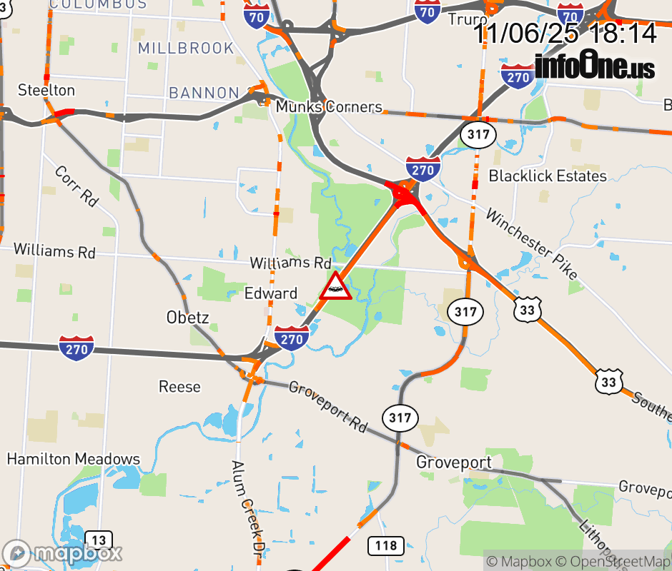 The left lane is blocked on I-270 North beyond Alum Creek Dr, due to a crash. ![]() |