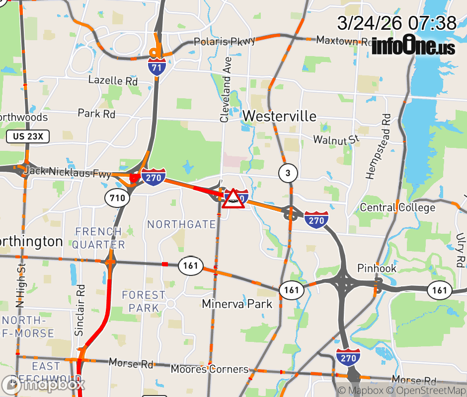 The left lane is blocked on I-270 East beyond SR-710/Cleveland Ave, due to a crash. Updated: Tue 3/24/26 7:38 AM EDT ![]() Updated: Tue 3/24/26 7:38 AM EDT |