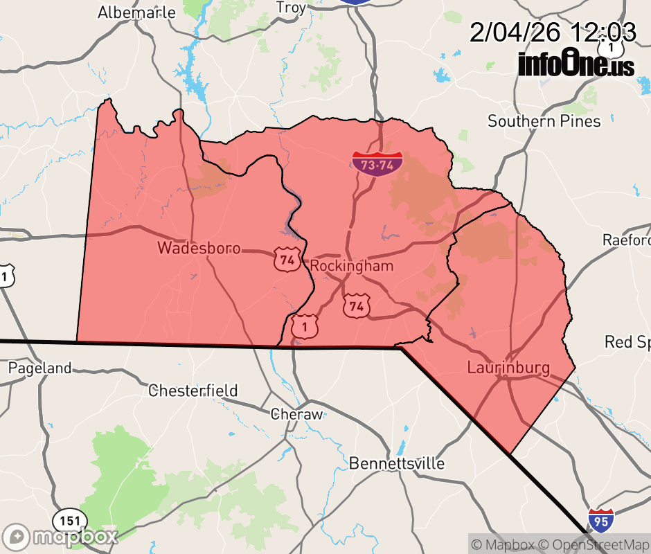 Canceled 2/4/26 6:12 PM Winter Weather Advisory issued February 4 at 12:02PM EST until February 5 at 10:00AM EST by NWS Raleigh NC * WHAT... Freezing rain expected. Total ice accumulations around a light glaze. * WHERE... Anson, Richmond, and Scotland Counties. * WHEN... From 6 PM this evening to 10 AM EST Thursday. * IMPACTS... Very slippery sidewalks, roads and bridges are possible. The hazardous conditions could impact the Thursday morning commute. ![]() |