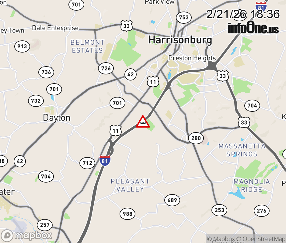 On I-81 at mile marker 244.6 in the City of Harrisonburg, motorists can expect delays due to a vehicle crash. The north right shoulder is closed. Updated: Sat 2/21/26 6:36 PM EST ![]() Updated: Sat 2/21/26 6:36 PM EST |