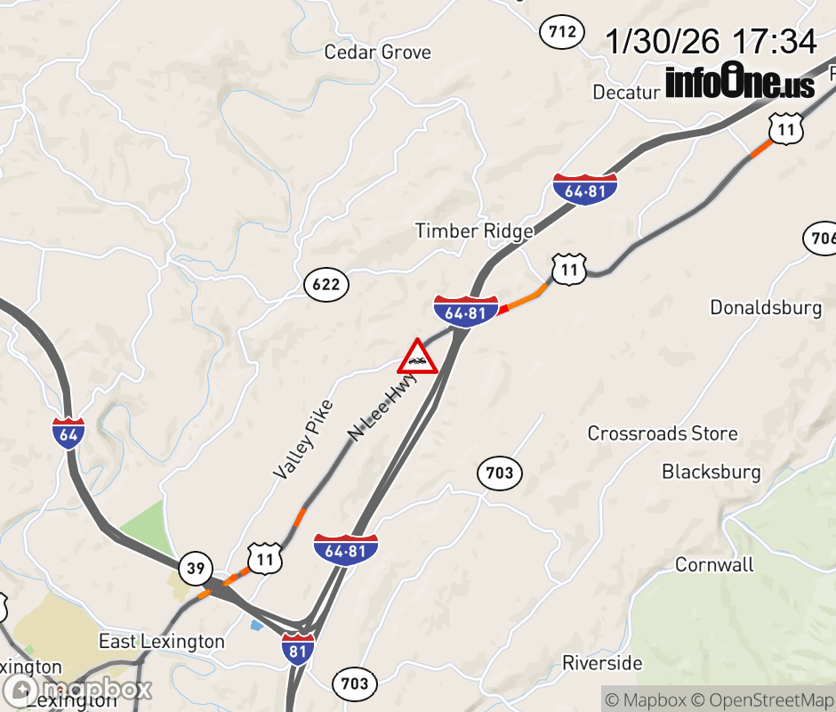 On US-11 in the County of Rockbridge, in the vicinity of Valley Pike; Rt. 645N/S (Rockbridge County), motorists can expect delays due to a disabled tractor trailer. All north lanes are closed. ![]() |